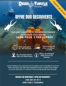 • L’Offre Duo Découverte : Offrez-vous à 2 une magnifique matinée de 2 plongées avec votre moniteur. Une première immersion en bord de plage pour découvrir le matériel, les sensations et la communication, puis embarquez vers un site de plongée pour une deuxième immersion de 40 minutes !